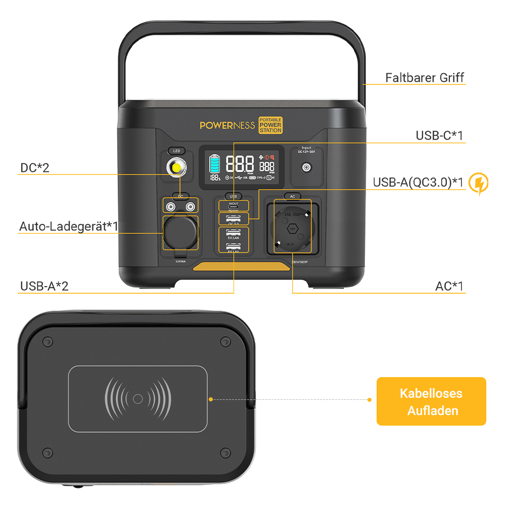 Hiker U300 has multiple outlets. The 2 AC outputs allow you to plug 2 household appliances, up to 300 watts. Beside, you get 3 USB outputs, 2 DC outputs, 1 USB-C PD 60W output, 1 cigarette lighter socket, and 1 wireless charging top.